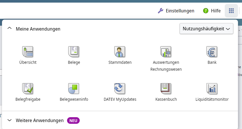 Entweder Sie erfragen Ihre Berater- und Mandantennumer bei Ihrem Steuerberater oder Sie wählen in Datev Unternehmen Online unter „Anwendungen“ die Anwendung „Belege“ aus.